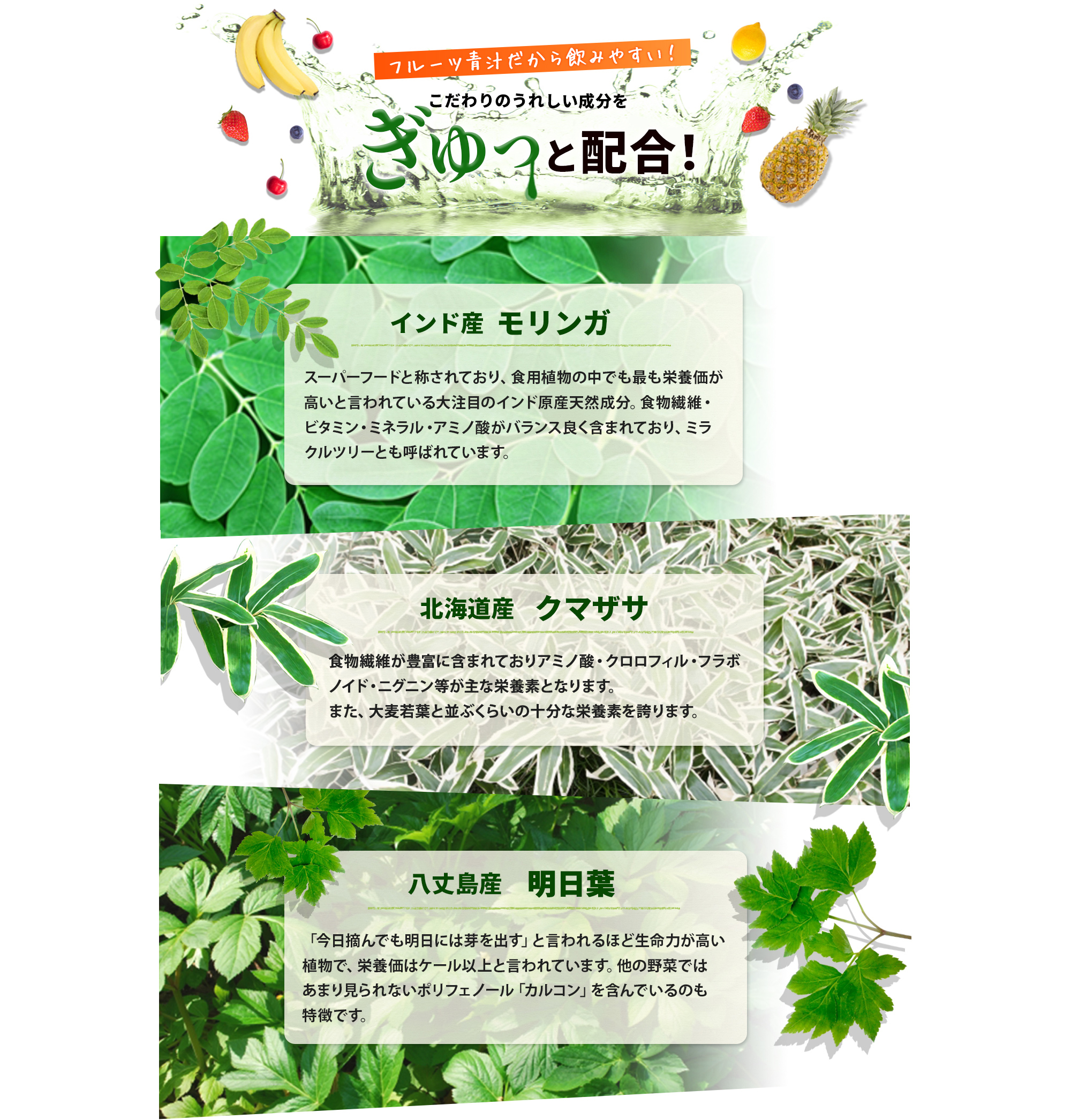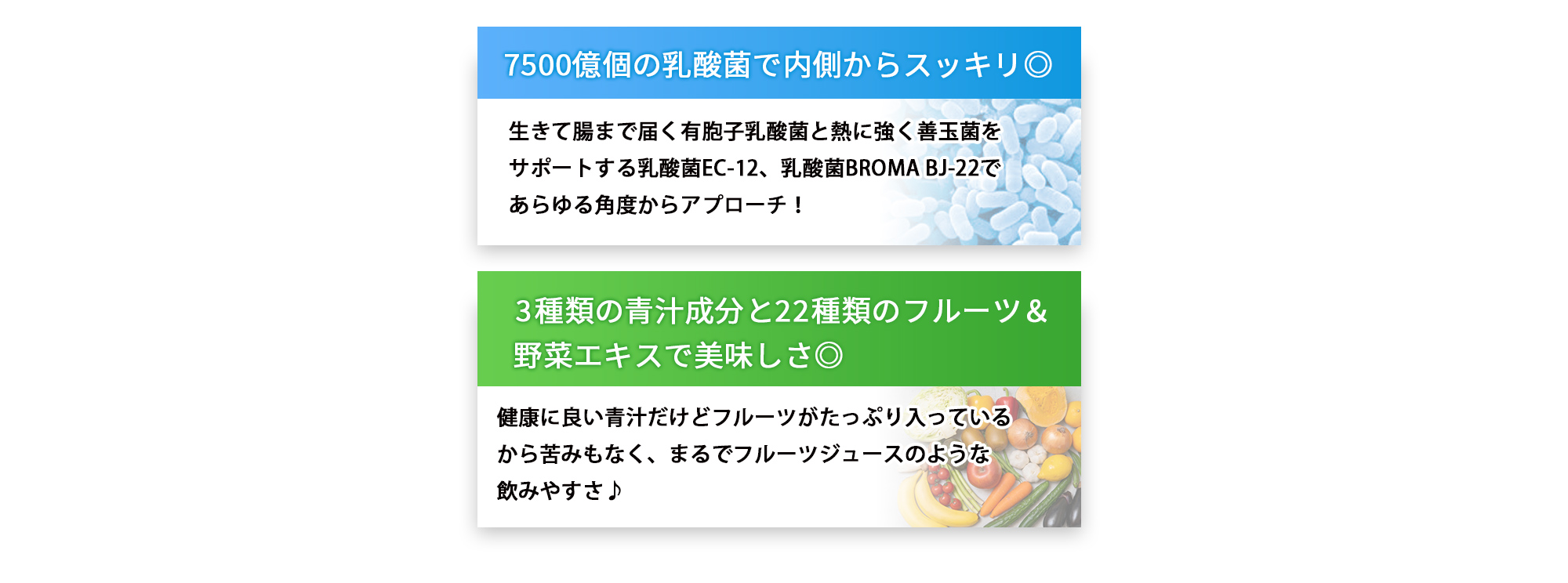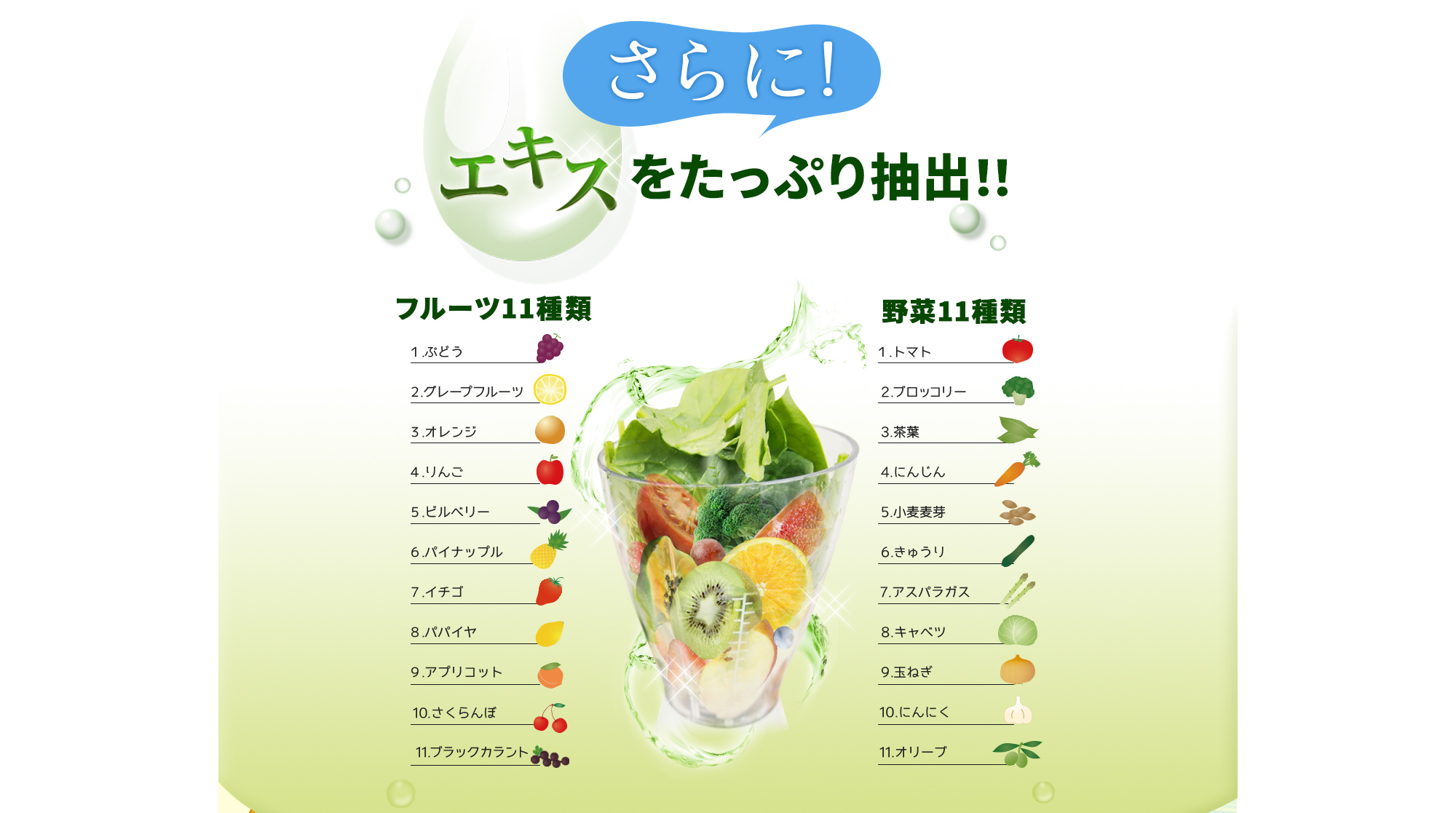 原材料名 還元麦芽糖水飴(国内製造)、デキストリン、クマザサ粉末、緑茶粉末、果汁パウダー、明日葉粉末、モリンガ粉末、蓮葉粉末、野草発酵エキス粉末(オリゴ糖、糖蜜、てんさい糖、ヨモギ、その他)、乳酸菌(殺菌)末、フルーツ・野菜抽出エキス、緑茶抽出物、乳糖、植物発酵物、メロンプラセンタ(胎座)抽出物、パイナップル果実抽出物、有胞子性乳酸菌、乳酸菌混合末(ビフィズス菌5種、乳酸菌17種)/香料、甘味料(ネオテーム、スクラロース)、シクロデキストリン、(一部に乳成分・小麦・やまいも・りんご・オレンジ・バナナを含む)