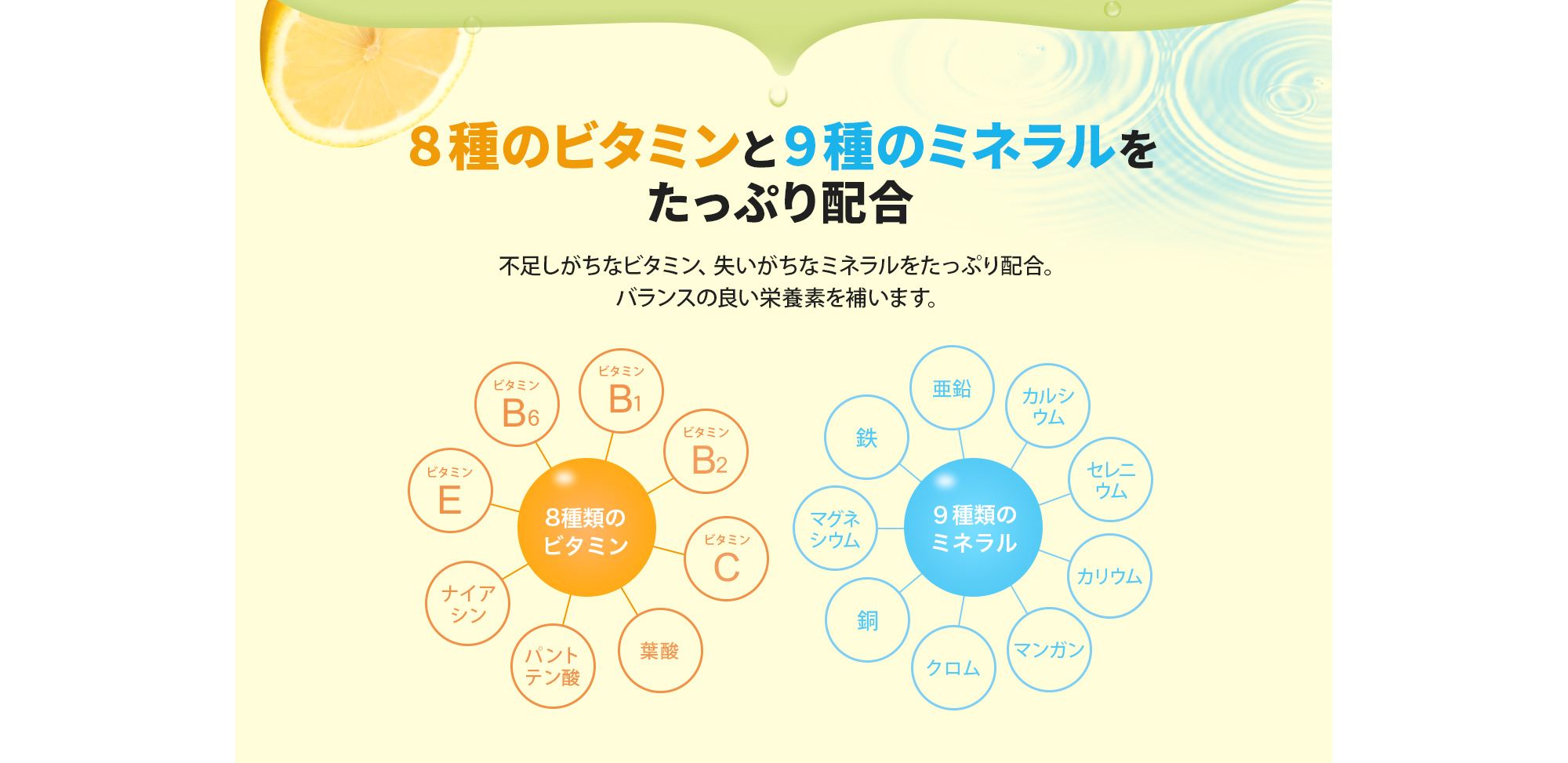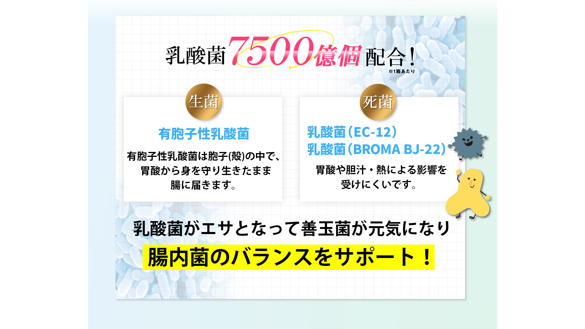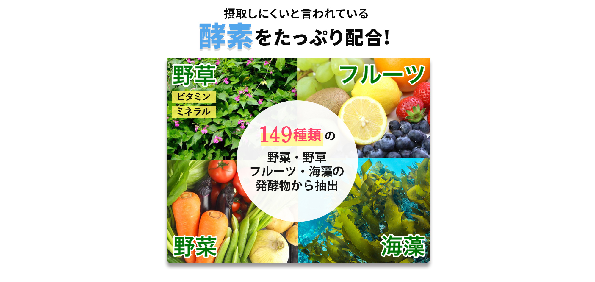 原材料名 還元麦芽糖水飴(国内製造)、デキストリン、クマザサ粉末、緑茶粉末、果汁パウダー、明日葉粉末、モリンガ粉末、蓮葉粉末、野草発酵エキス粉末(オリゴ糖、糖蜜、てんさい糖、ヨモギ、その他)、乳酸菌(殺菌)末、フルーツ・野菜抽出エキス、緑茶抽出物、乳糖、植物発酵物、メロンプラセンタ(胎座)抽出物、パイナップル果実抽出物、有胞子性乳酸菌、乳酸菌混合末(ビフィズス菌5種、乳酸菌17種)/香料、甘味料(ネオテーム、スクラロース)、シクロデキストリン、(一部に乳成分・小麦・やまいも・りんご・オレンジ・バナナを含む)